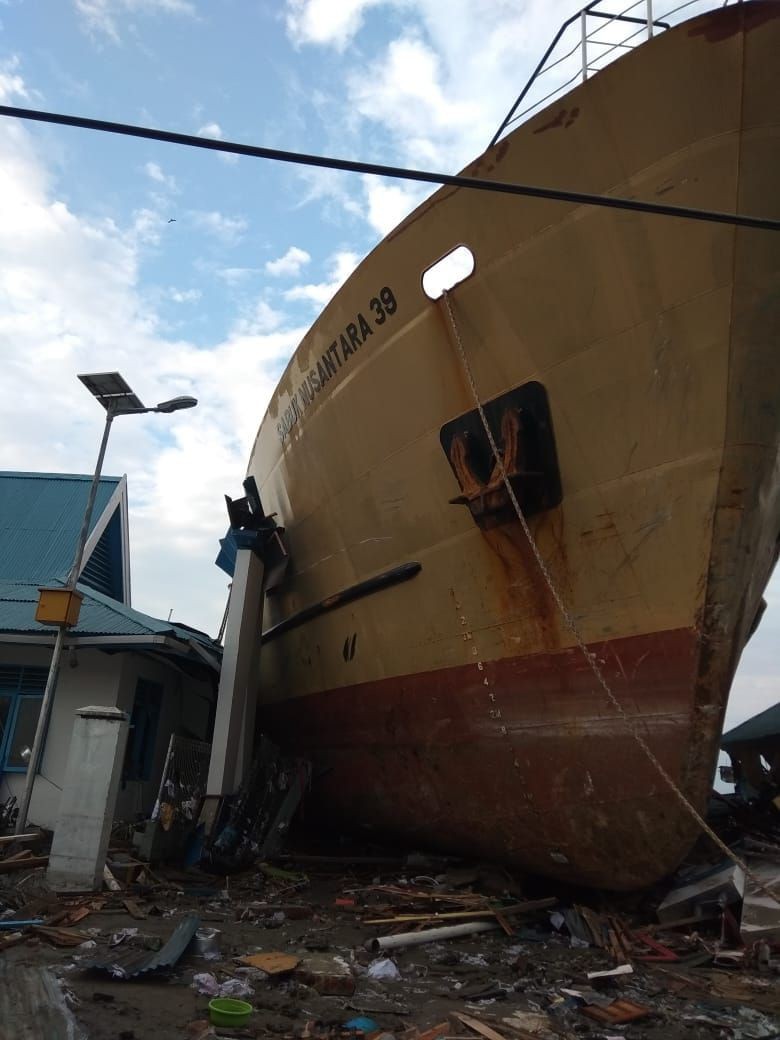 Kapal Perintis Nusantara 39 terlihat naik ke daratan dan menghantam sebuah bangunan pasca hantaman tsunami. Naiknya kapal itu ke daratan menyebabkan bangunan tersebut mengalami kerusakan.